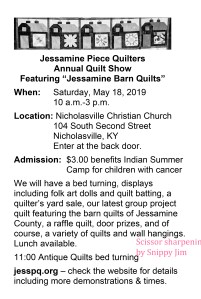 The 2019 Jessamine Piece Quilter Annual Quilt Show Featuring “Jessamine Barn Quilts” is scheduled for Saturday May 18, 2019, at Nicholasville Christian Church, 104 South Second Street, Nicholasville KY. Enter at the back door (follow the signs).